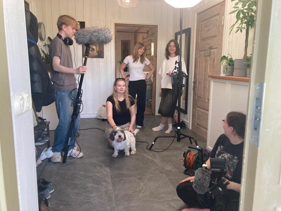Filmivõtted. Näha on erinevaid noori, ühel käes suur mikrofon, teine hoolitseb valgustuse eest, kolmas tegeleb kaameraga ning kaks niisama jutustavad ja mängivad koeraga.