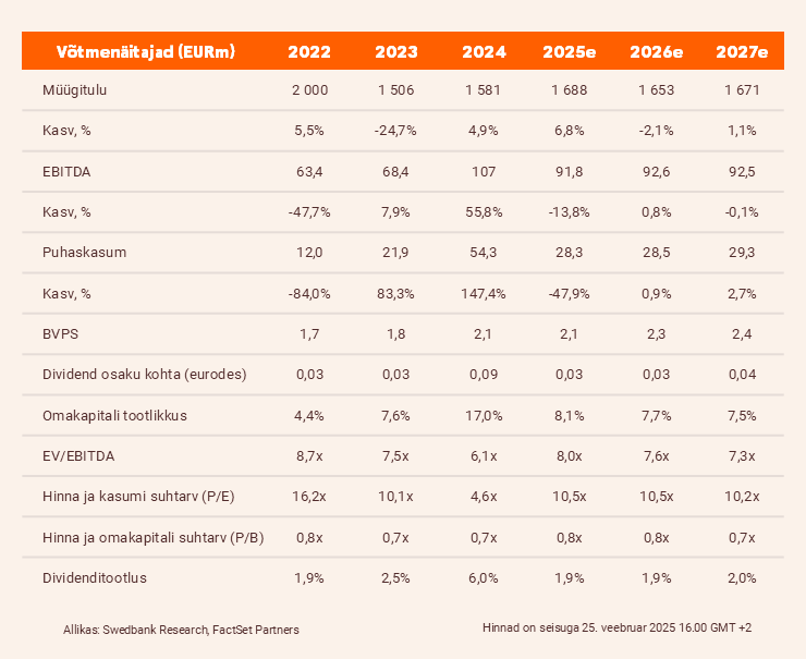 Hoiame 2025/2026. aasta EBITDA prognoosi 92 miljoni euro juures, kuna teravilja, õliseemnete ja loomasööda kasumlikkuse mõningast vähenemist tasakaalustab toidutootmise (linnuliha) märgatavalt suurem kasumlikkus. Samal ajal vähendame 2025/2026. aasta puhaskasumi prognoosi 10% ehk 28 miljoni euroni, mis kajastab peamiselt suurenenud amortisatsiooni (kasvanud kapitalikulude tõttu). Meie pikemaajaline EBITDA prognoos jääb samuti muutmata. Säilitame diskonteeritud rahavoogude meetodil arvutatud hinnasihi 2 eurot, mis hindab Akola Groupi 8-kordse 2025/2026e EBITDA kordaja ning 12-kordse P/E joones, ehk üldjoontes kooskõlas viimase kuue aasta vastavate keskmistega. Kordame ostusoovitust.