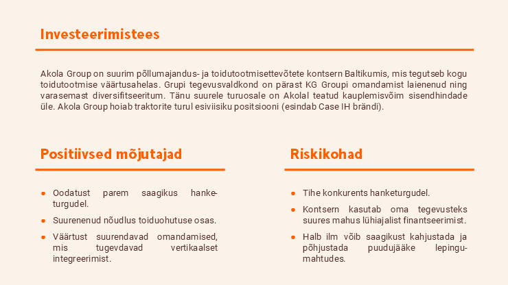 Kontsern viitas mitmele hindamisel olevale projektile, mille kogumaksumus on 124 miljonit eurot. Nende hulka kuuluvad lemmikloomatoidu tootmine (20 miljonit eurot), uus tehas Kaišiadoryses (34 miljonit eurot, mis on seotud loomsete kõrvalsaaduste töötlemise taristu arendamisega) ning söödatootmise laiendamine (70 miljonit eurot, mille eesmärk on suurendada lahtise sööda ja pelletsööda tootmisvõimsust umbes 50%). Akola Groupi investeeringute lävenditeks on tüüpiliselt tasuvusaeg 5–6 aastat ja 10–15% tootlus. Meie hinnangul lisaksid kõik kolm projekti täielikult elluviiduna umbes 20–25 miljonit eurot ehk vähemalt viiendiku kontserni 70–90 miljoni euro suurusest EBITDA eesmärgist. Teeme oma prognoosides kohandused siis, kui projektid on kinnitatud.