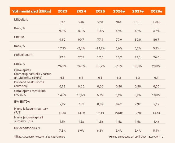 Kokkuvõttes jätame oma prognoosid enamjaolt muutmata, kuid kergitame tänu tugevale esimesele kvartalile Baltimaade sõidukite esmasturu 2026. aasta prognoosi. Säilitame hinnasihi 9 eurot ja kordame neutraalset soovitust, mis hindab TKMi 8,6-kordse EV/EBITDA kordaja ning 1,5-kordse P/B juures, võrreldes vastavate pikaajaliste keskmistega 8,4x ja 1,6x.