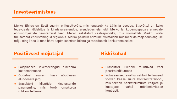 Meie praegune EPC-põhine mudel ei võimalda PPP mõju adekvaatselt hinnata. Seetõttu eemaldame kogu endise Rūdninkai mõju oma varasematest prognoosidest ning hindame projekti edaspidi eraldi SPV kaudu, kasutades diskonteeritud rahavoo mudelit. Merko Ehituse väärtuse hindamiseks rakendame edaspidi SOTP-meetodit. Hindamisel lähtume eeldusest, et Merko müüb SPV 2028. aasta lõpus 8% terminaalse diskontomäära juures, mis annaks projekti väärtuseks 1,6 eurot aktsia kohta.
