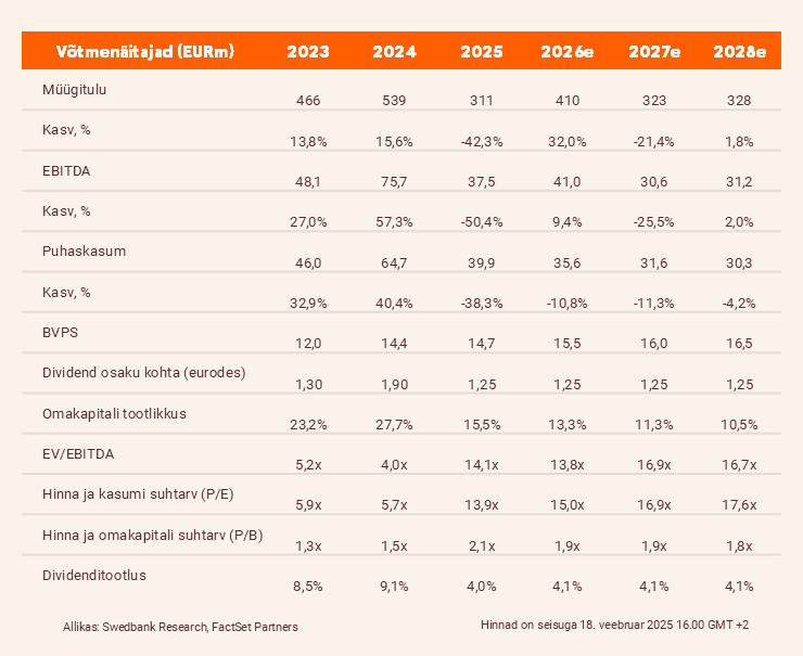 Viime algse mudeli, millest Rūdninkai on nüüd välja jäetud, üle uude aastasse. Koos SPV valuatsiooniga on SOTP-põhine hinnasiht 31 eurot, mis hindab Merko Ehitust 13,2-kordse 2026. aasta EV/EBITDA juures. Kuigi EBITDA kordaja on 10 aasta keskmisest (8,7x) tunduvalt kõrgem, on see madalam kui 2025. aastal (14,1x). Seetõttu kordame neutraalset soovitust. Samas sõltub SPV valuatsioon suurel määral lõplikest rahastamistingimustest, mis selguvad hiljemalt juuni keskpaigaks, mistõttu võivad meie prognoosid hiljem muutuda.