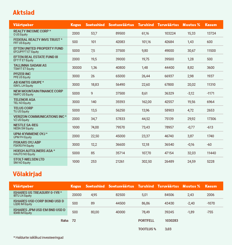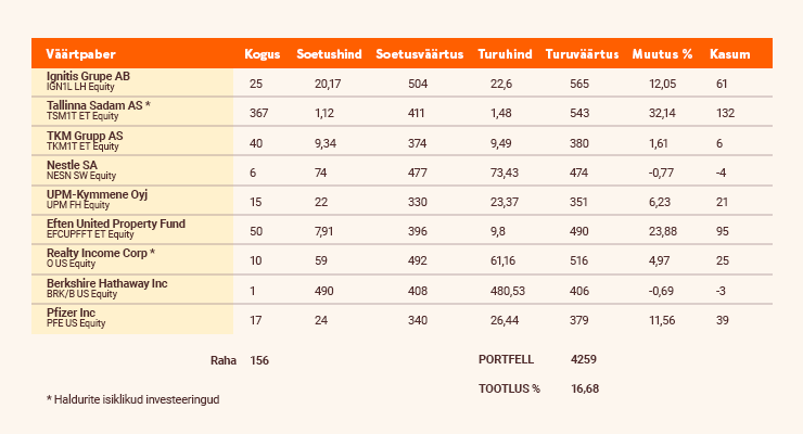 Igal kuul jagame Sinuga ülevaadet, kuidas läheb podcast’i „Investeerimisjutud“ virtuaalportfellidel.