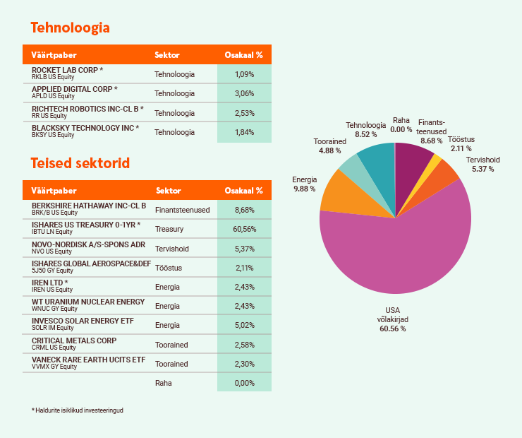 Jaanuari viimase päeva seisuga on Suurel Peetril nüüd kaks eraldi portfelli ning mõlemad alustasid oma tulevast investeerimisteekonda ühe miljoni euroga. Esimene investeerib rahavoogu tootvatesse instrumentidesse, kuhu kuuluvad nii dividendiaktsiad kui ka võlakirjad. Teine portfell keskendub vaid kasvuaktsiatele ning kandev roll on seal tehnoloogiafirmadel. Ilmselgelt on ka mõlema portfelli oodatav tootlus ning riskitase erinevad ning aitavad meiepoolse koolitusprojekti raames seda ka Investeerimisjuttude podcasti kuulajatele praktiliselt tõestada.