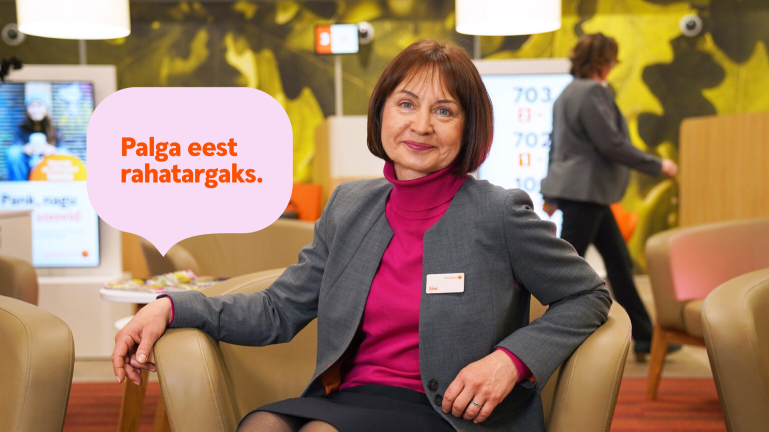 Kliendinõustaja istumas Swedbanki kontoris ja naeratamas.