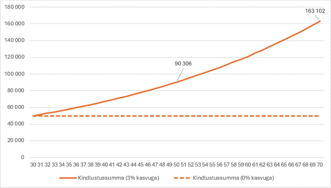 Kindlustussumma suurendaja arvutuskäik 30 aastase kliendi näitel, kelle tänane kindlustuskaitse on 50 000 eurot:
