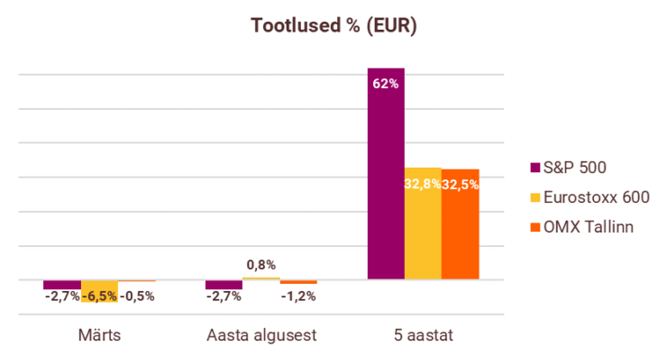 Eurostoxx 600 indeks langes märtsis 6,5%. Samal ajal kukkus SP500 indeks möödunud kuul eurodes mõõdetuna 2,7% ning Nasdaq100 taandus 2,4%. Hästi läks vaid energiasektori ettevõtetel ning suurimad kaotajad olid kinnisvarafirmad, tööstusettevõtted ning tarbekaupade tootjad.