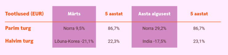 Investorite jaoks pakkusid märtsis positiivset tootlust Norra ja Brasiilia aktsiaturud, mis kasvasid eurodes mõõdetuna vastavalt 9,5% ja 0,5%. Väikese naftafirmade osakaaluga börsid meenutasid möödunud kuul kõik kahe jalaga taburetti, mis püsti seista ei suutnud. Klassikaline hajutamine suuremate aktsiaturgude vahel märtsis investorit ei aidanud, sest kui sul ei olnud portfellis naftat, mis inflatsioonihirme tekitas, siis oli varade väärtuse langus paratamatu.