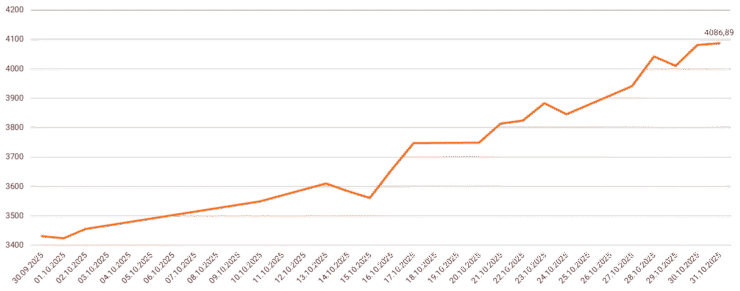 Eurostoxx 600 indeks tõusis oktoobris 2,0%. SP500 indeks kasvas möödunud kuul eurodes mõõdetuna 4,4% ning Nasdaq100 6,8%. Investorid vaimustuvad tehnoloogiasektori investeeringutest tehisintellekti arengusse ja buumi vaibumist hetkel ei paista. Tasub olla ettevaatlik, kui valdav osa investoreid on liiga eufoorilised.