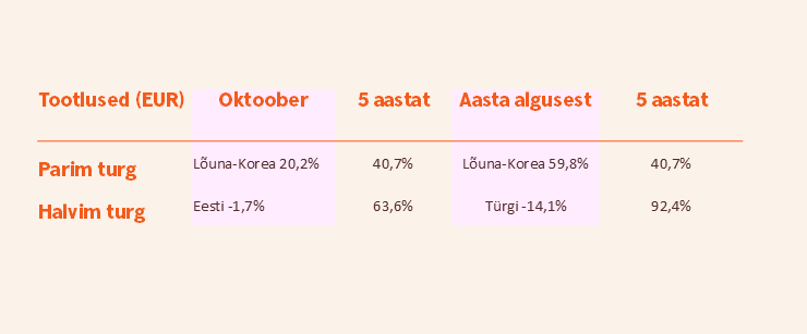 Investorite jaoks pakkusid oktoobris parimat tootlust Aasia aktsiaturud. Lõuna-Korea börs kasvas eurodes mõõdetuna kuuga 20,2% ning Jaapan 14,1%. Tugev oli ka Taiwani börs, kus tehnoloogiafirmad särasid tugevate tulemustega.