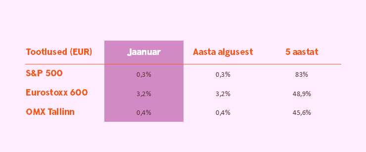 Eurostoxx 600 indeks tõusis jaanuaris 3,2%. Samal ajal tõusis S&P 500 indeks eurodes mõõdetuna 0,3% ja Nasdaq100 langes 0,2%. Ülemaailmse mälukiipide defitsiidi tingimustes parimate aktsiate hinnad kuuga mitmekordistusid, kuid samal ajal muutis investorid murelikuks Microsofti teade kasvu aeglustumisest ning tehisintellekti sektorisse investeerimise tõttu kiiresti kasvavad kulud.