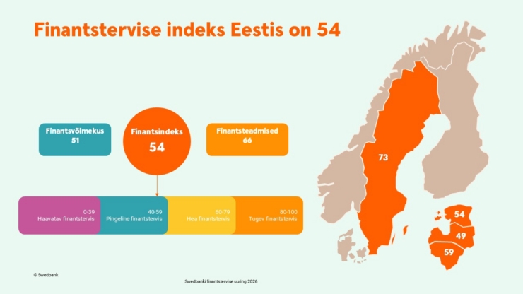 Swedbanki Rahaasjade Teabekeskuse täna avaldatud uuringu andmeil on kõigis Balti riikides inimeste finantstervis pingeline. Indeks mõõdab inimeste finantsvõimekust ja -teadmisi ning jaguneb neljaks tasemeks: tugev (80–100), hea (60–79), pingeline (40–59) ja haavatav (0–39 punkti). Finantstervise indeks on Eestis 54, Lätis 49 ja Leedus 59 punkti, samas kui Rootsis ulatub see 73 punktini.
