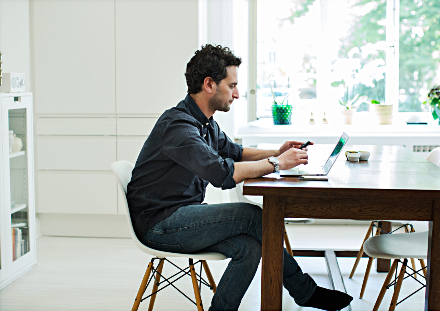 Mees istumas laua taga ja vaatab arvutist midagi.