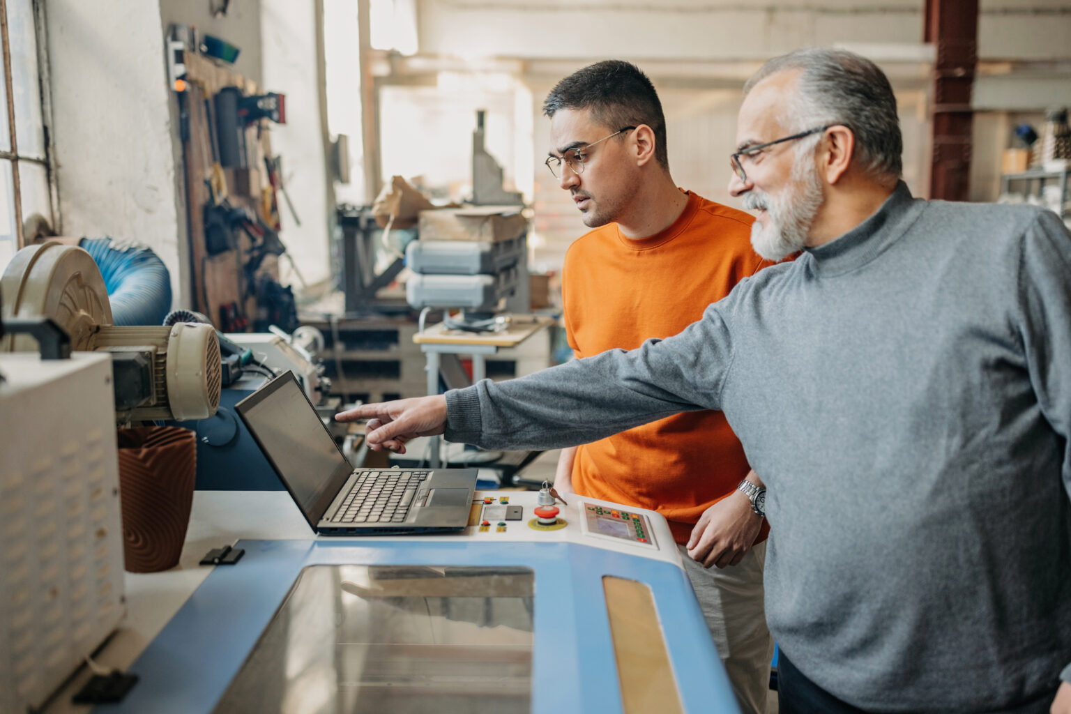Kaks meest on kuskil töökojas, nende ees on arvuti ja vanem mees selgitab midagi sellelt arvutilt.